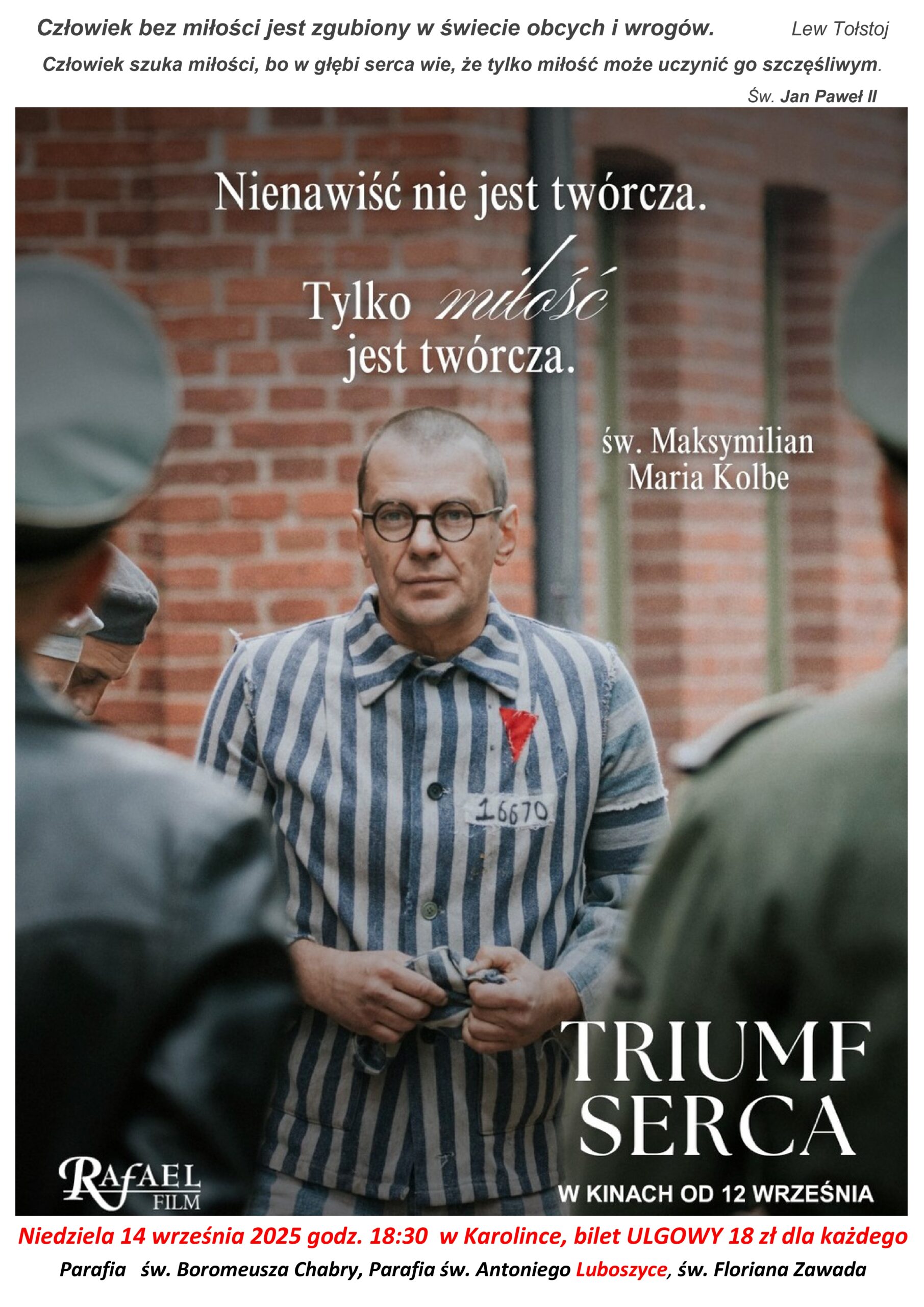 Niedziela 14 września 2025 godz. 18:30 KINO HELIOS w Karolince, bilet ULGOWY 18 zł dla każdego. Zapisy w zakrystii.