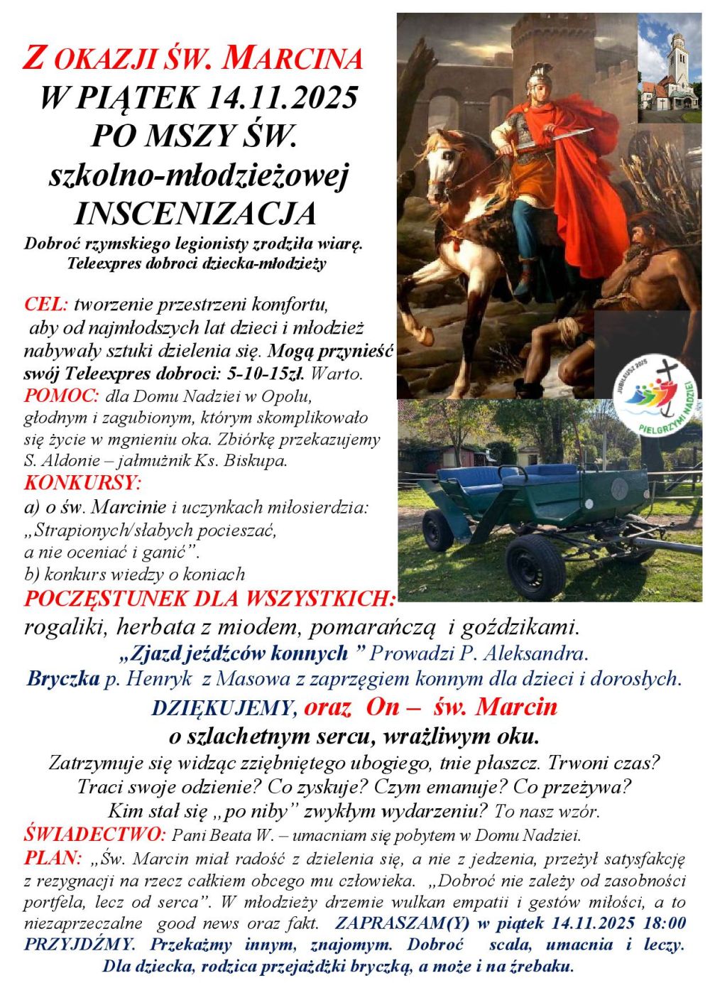Z okazji dnia ubogich we wspomnienie patronki wyobraźni miłosierdzia bł. L. Merkert ku czci ŚW. MARCINA zgromadziło się ponad 170 dzieci i młodzieży w procesji światła oraz kilkaset dorosłych na inscenizacji, celem wsparcia ubogich z Domu Nadziei.